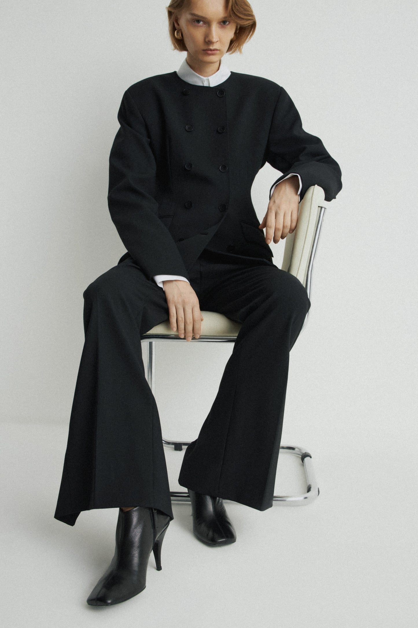 Trousers with creases made from a woven fabric contains some wool. Slim-leg design with slightly flared slitted hems. Featuring front pockets and rear welt pockets. Front zip fly, button and metal hook fastening.