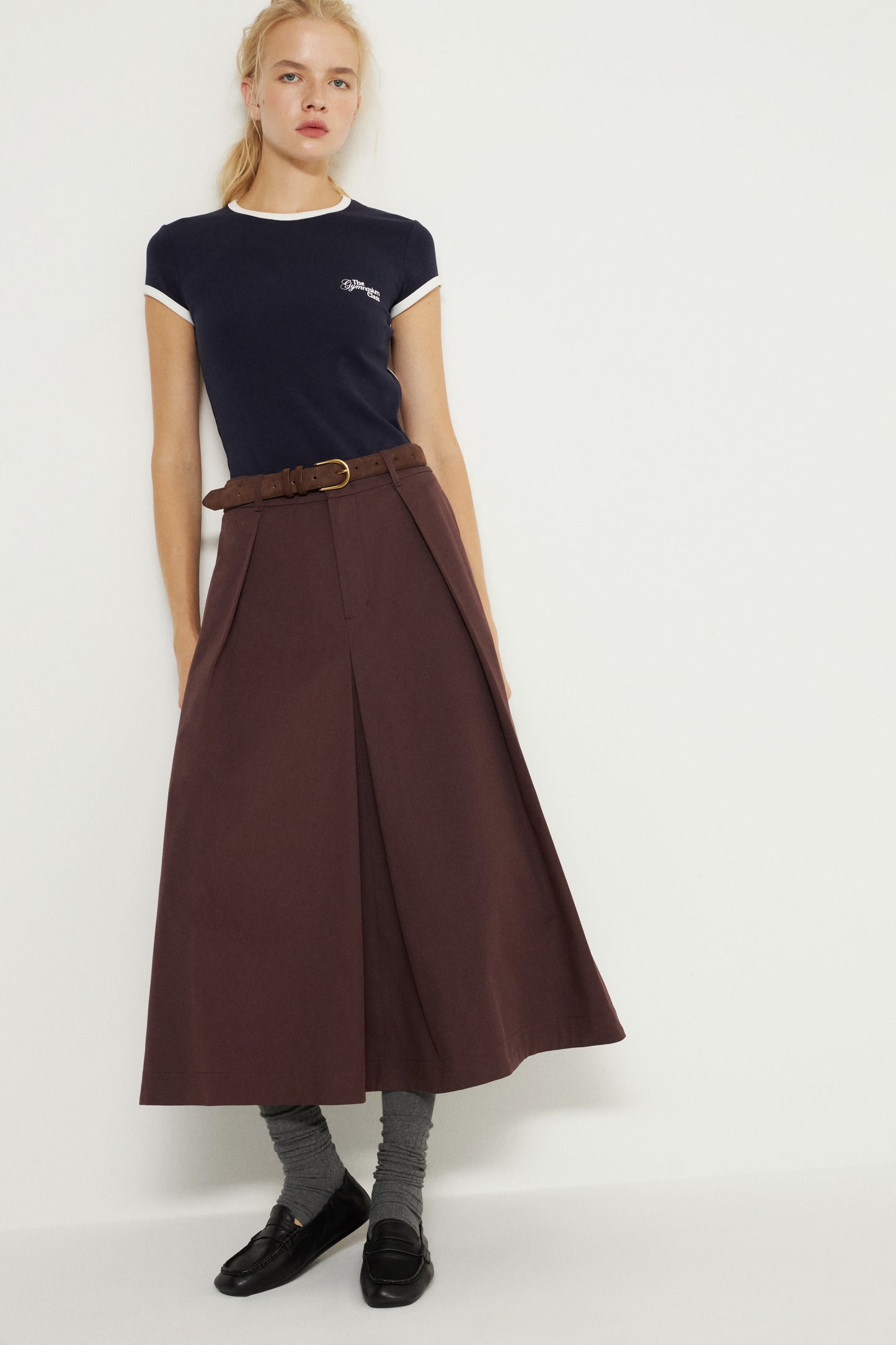 A-line midi skirt in cotton. Pleated regular waist, inverted box pleat below hip for added volume. Featuring front pockets and button and metal hook fastening.